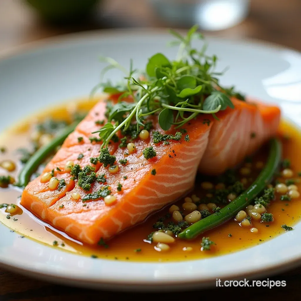 Questa non è solo una delle tante Ricette salmone fresco al forno ; è un'esperienza tattile. La panatura, composta da pistacchi tritati finemente, scorza di limone e aromi mediterranei, sigilla i succhi all'interno, garantendo che ogni boccone sia succoso.